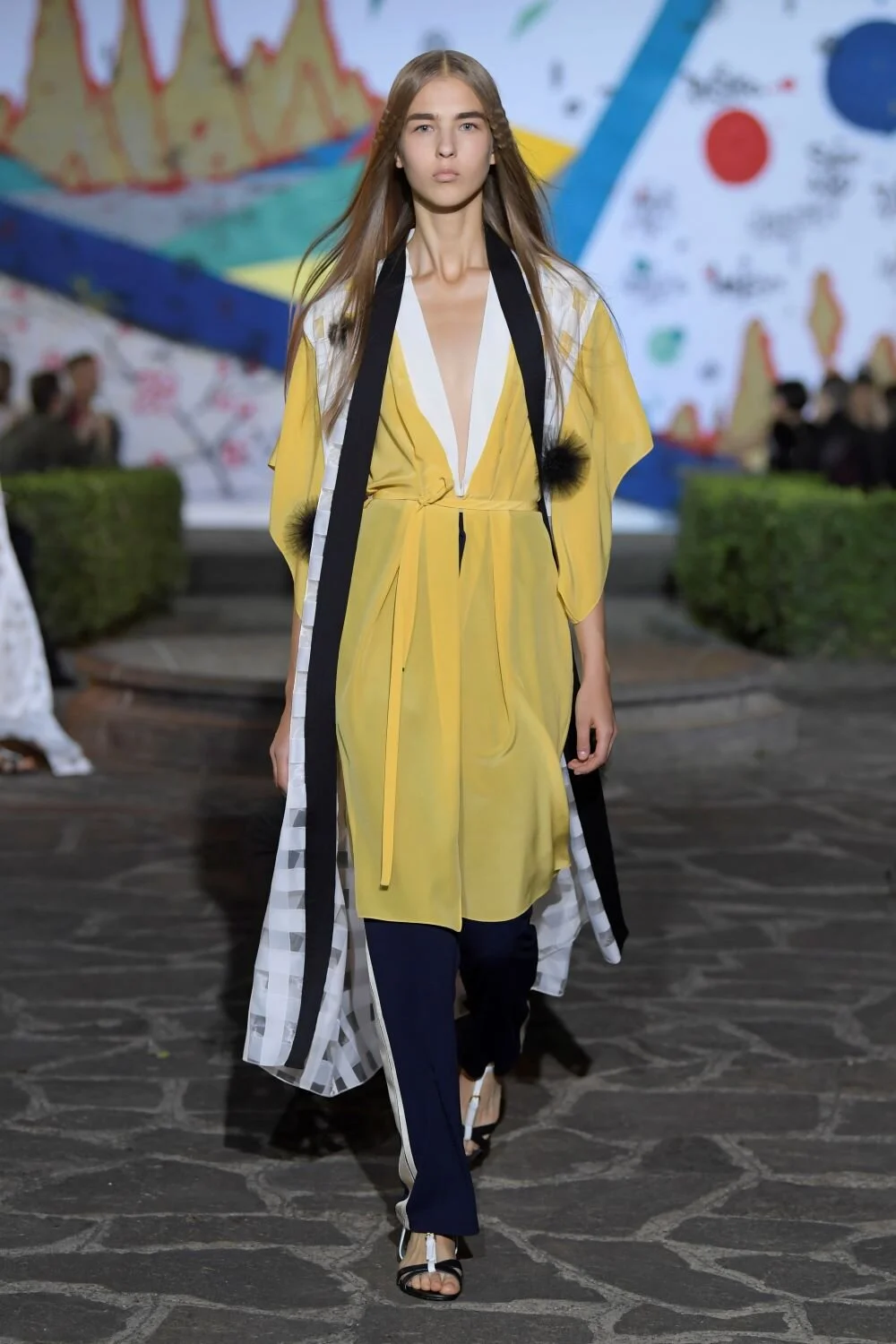 The designer also played with transparency against solid materials. A quasi-transparent white checked material was embellished with black tulle pompoms and made into a hooded coat and a dress which slightly resembled origami, calling upon the Japanese inspiration once more. Colourful strings, which were seen throughout the collection on trouser suits and on entirely see-through ethereal dresses, were fashioned into an entire dress which would look great worn as a top, perhaps with a pair of one of those jeans.